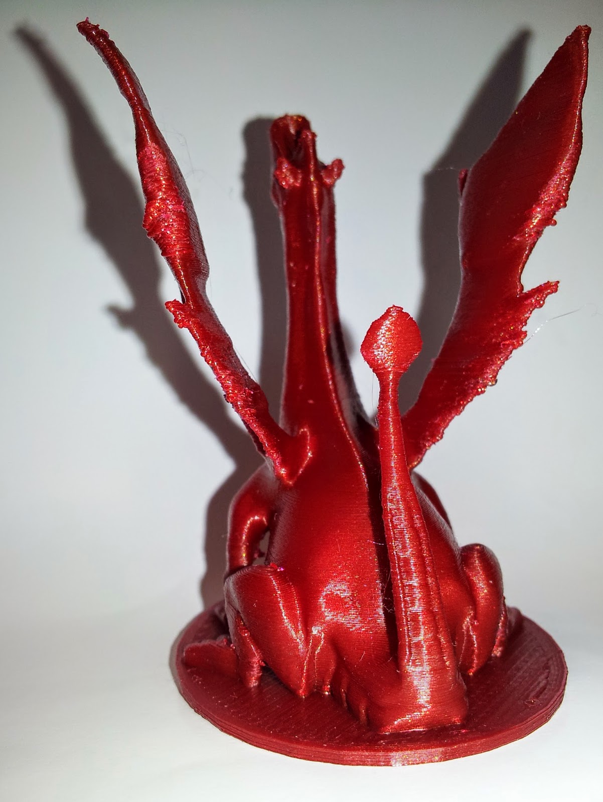 I printed this dragon from loubie on Thingiverse. Since the figure was printed at 50% scale (total height is about 8 cm), the front legs were a bit too fragile, so I added a little base to make the model a bit stronger.