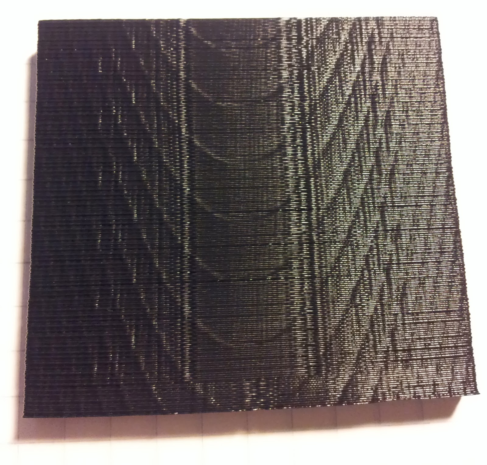 There are some artifacts showing up in the prints of the delta printer. Depending on the shape of the object they are more or less visible. I printed a flat vertical object, 80 x 80 mm, to be able to see the effect properly: